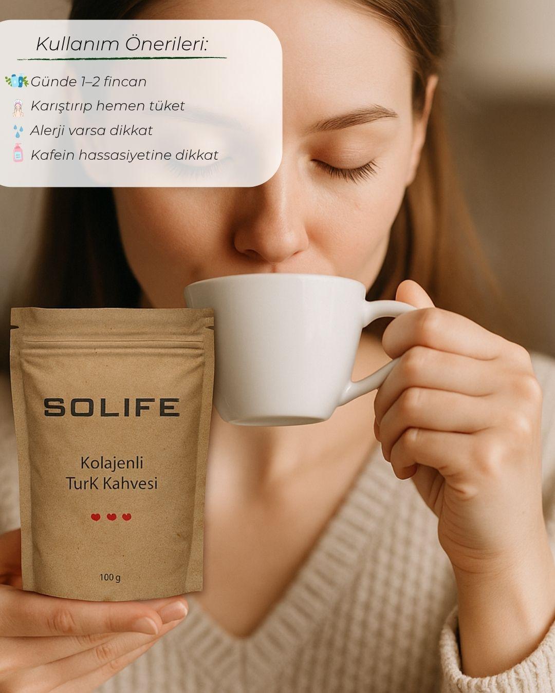 Hazırlanışı: Her Türk kahvesi fincanı için 2 çay kaşığı (yaklaşık 6 gr) Kolajenli Türk Kahvesini su ile birlikte cezveye koyun, damak tadınıza göre şeker ilavesi yapın ve köpürünceye kadar cezvede kısık ateşte kaynatın. Köpükleri fincana aldıktan sonra kalan kahveyi tekrar kaynatıp ekleyin.