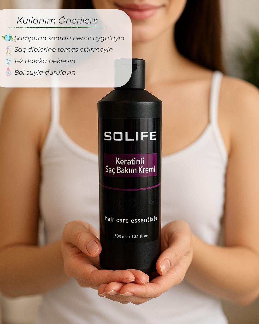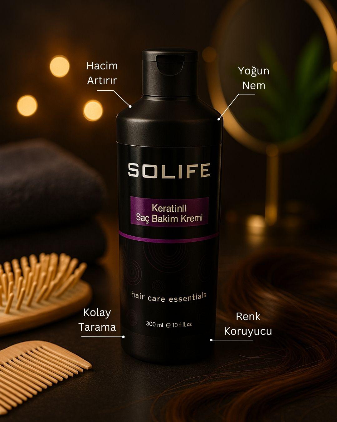 Solife Keratinli Saç Bakım Kremi, saç tellerini onarmak, güçlendirmek ve parlaklık kazandırmak için özel olarak formüle edilmiş bir saç bakım ürünüdür.