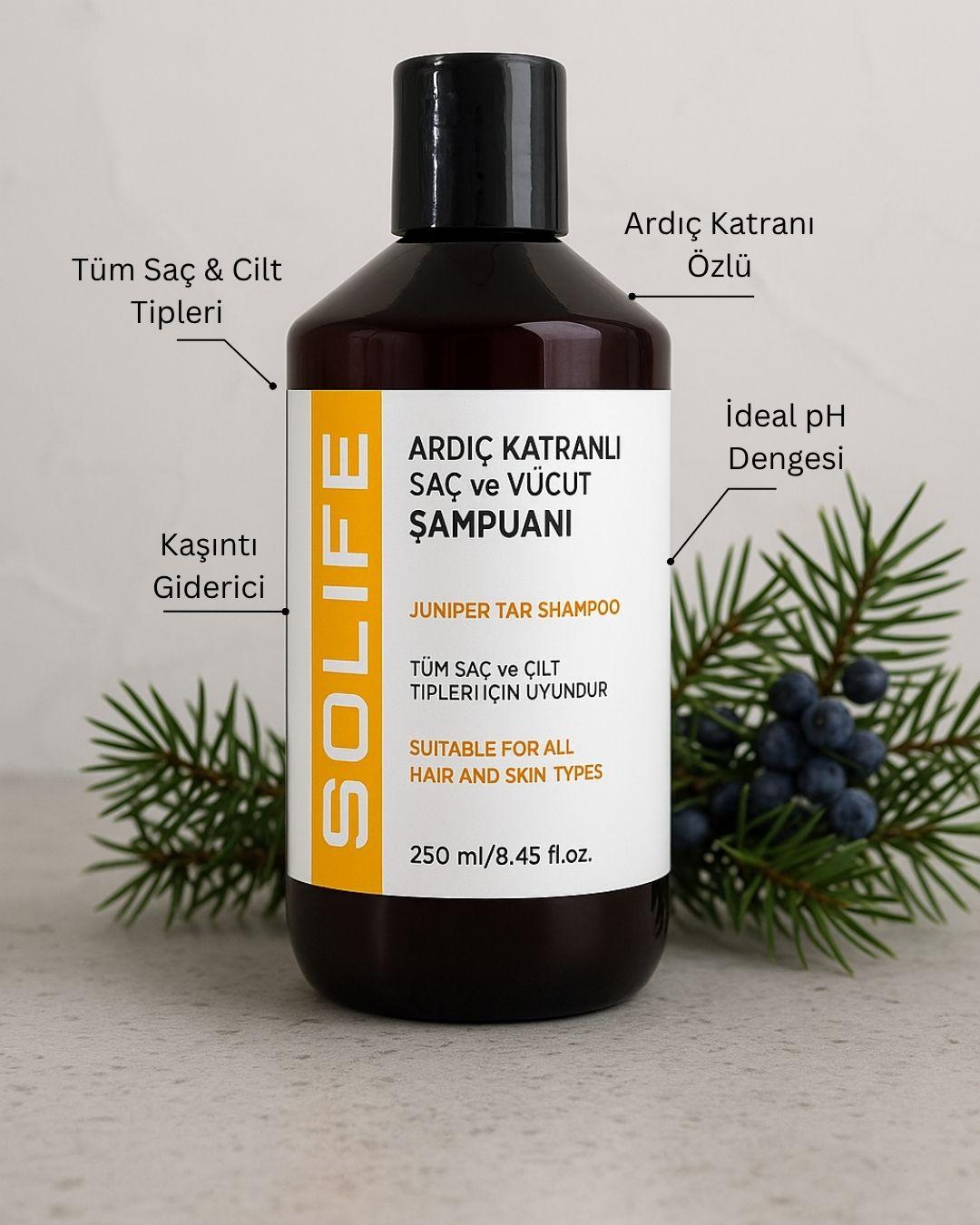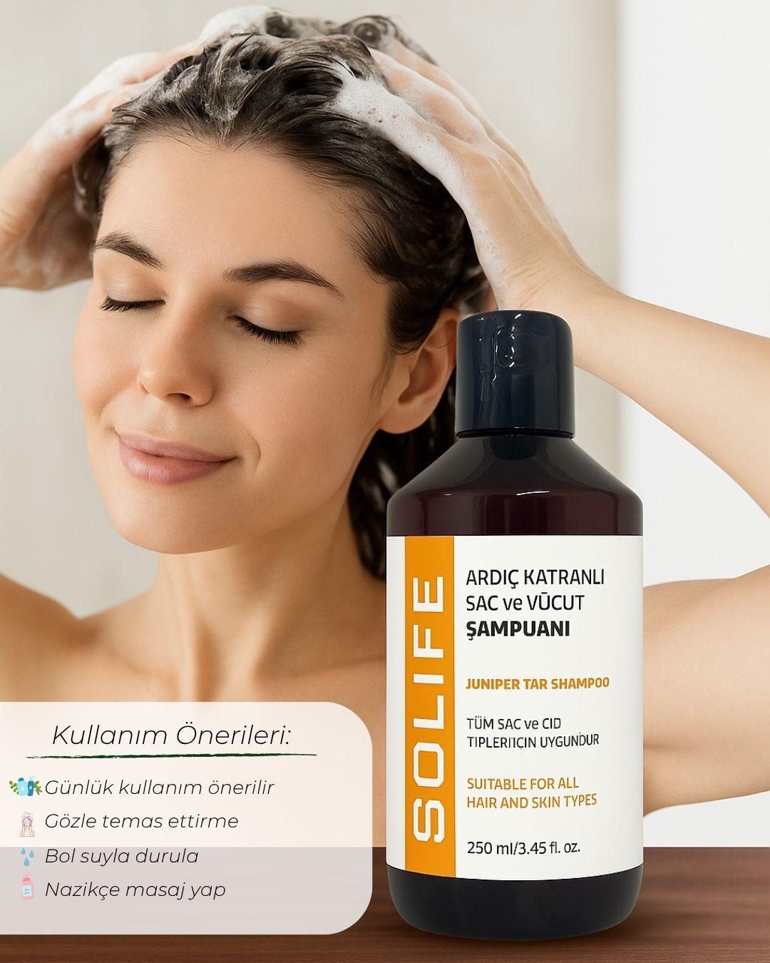 Şampuan ve duş jeli olarak kullanıma uygundur. Ardıç katranının doğal özellikleri ile zenginleştirilmiş olan bu şampuan, saç ve vücut temizliğini tek bir pratik adımda gerçekleştirmenize yardımcı olur.