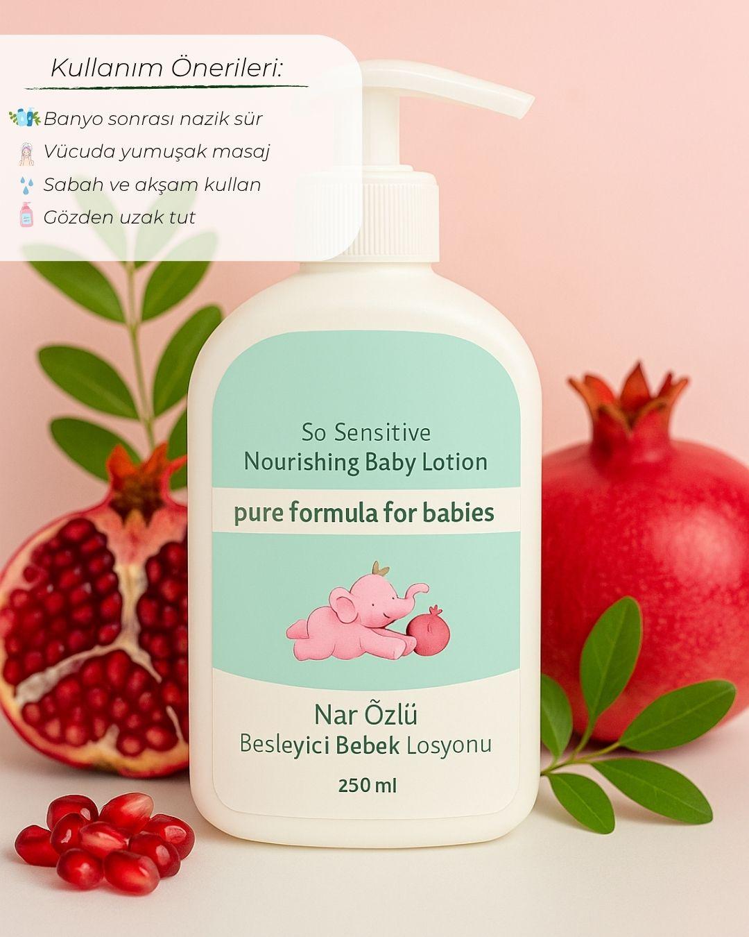 Nar özlü besleyici bebek losyonu, cildi nazikçe nemlendirir ve besler. %100 doğal nar özleriyle zenginleştirilmiş formülü, bebek cildini sağlıklı ve pürüzsüz tutar. Hassas ciltler için özel olarak geliştirilmiştir, paraben ve zararlı kimyasallar içermez. Bu hafif ve hızlı emilen losyon, bebeğinizin cildini yumuşatırken doğal bir koruma sağlar. Nar Özlü Besleyici Bebek Losyonu ile bebeğinizin cildini sevgiyle sarın, doğanın güzelliklerini keşfedin.