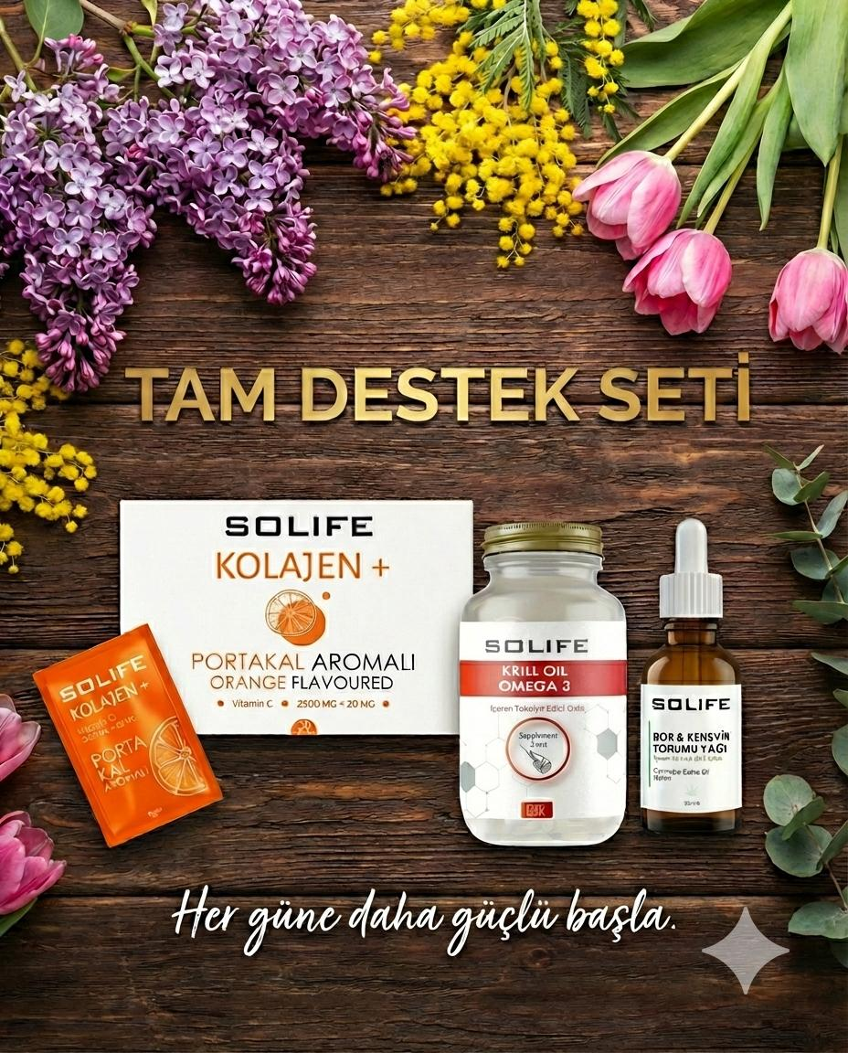 Tam Destek Seti; 30’lu portakallı toz kolajen, krill oil omega-3, bor ve kenevir tohumu ile günlük sağlığınızı, enerjinizi ve yaşam kalitenizi güçlendirmek için tasarlandı. Çünkü güçlü bir kadın, bütünsel destekle fark yaratır.